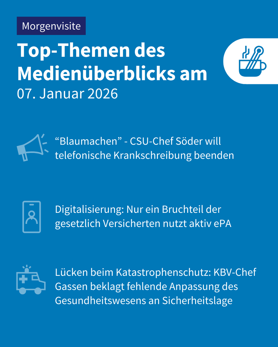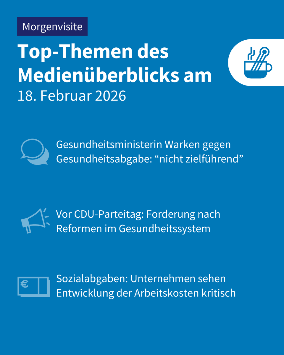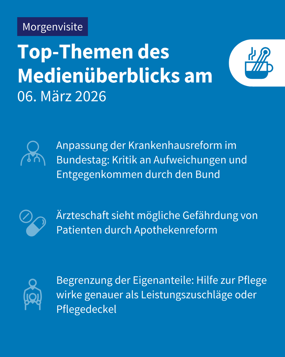 Mit der PKV-Morgenvisite starten Sie gut informiert in den Arbeitstag. Von Montag bis Freitag erhalten Sie gegen 7:30 Uhr eine Zusammenfassung der wichtigsten gesundheitspolitischen Nachrichten in den deutschen Medien - kostenfrei.