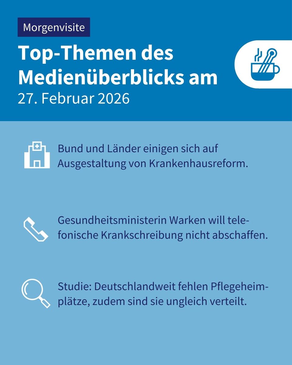 Einigung: Im Ringen um die #Krankenhausreform haben sich die Länder gegenüber dem Bund durchgesetzt. Außerdem in der #Morgenvisite ☕️: Telefonische Krankschreibung soll bestehen bleiben und deutschlandweit fehlen über 60.000 Pflegeheimplätze. Mehr ➡️ t.co/j8msKtfLnet.co/JvIcOrI6RMt.co/cUNN2uBZmZ"