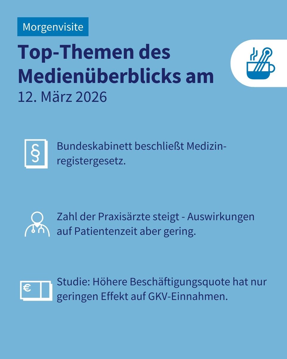 Das Bundeskabinett hat gestern das #Medizinregistergesetz verabschiedet. Hochschulen warnen vor fehlender Finanzierung. Außerdem in der #Morgenvisite ☕️: Zahl der Praxisärzte steigt und Rentner sowie Teilzeit könnten zum Problem für Krankenkassen werden.➡️ t.co/d9BmClry4wt.co/OWAQSr59GDt.co/Fwnxu0487A"