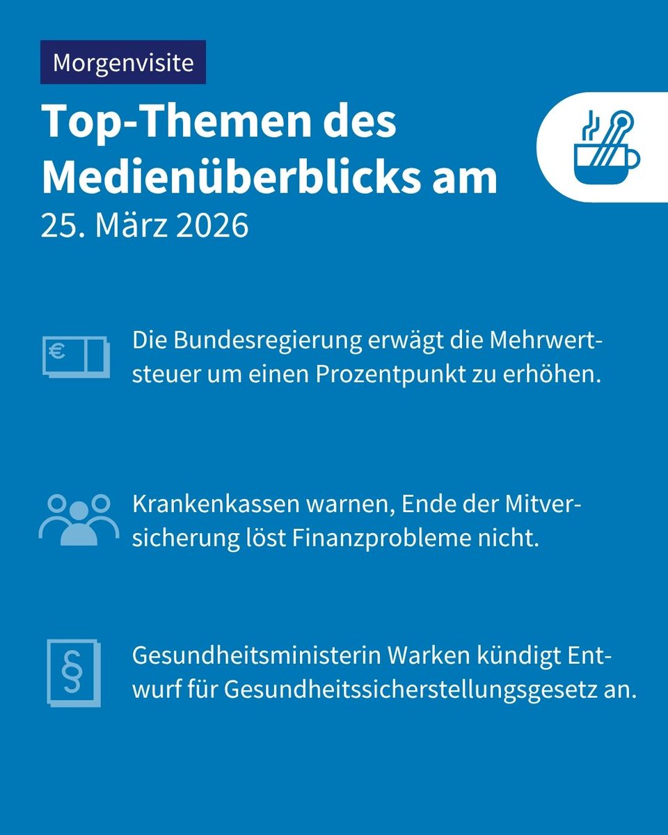 Die Bundesregierung erwägt eine Anhebung der #Mehrwertsteuer, um im Gegenzug u. a. die Sozialbeiträge zu senken. Außerdem in der #Morgenvisite ☕️: Stimmen zu möglicher Abschaffung der Mitversicherung und Entwurf für ein Gesundheitssicherstellungsgesetz. ➡️ t.co/4ysWoke659t.co/hb2PDSXSlPt.co/yh8vT1XiMZ"