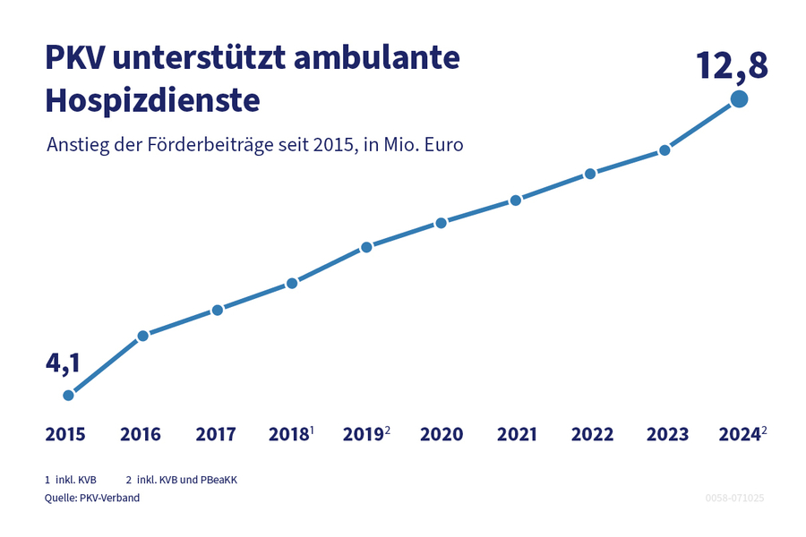 Insgesamt erhielten die Einrichtungen 12,8 Millionen Euro von der PKV. Damit erreicht der Förderbetrag der Privaten Krankenversicherung einen neuen Höchststand. Die ambulanten Hospizdienste leisten Sterbebegleitung von Patienten, die keiner Behandlung in einem Krankenhaus oder stationärem Hospiz bedürfen. Diese Aufgabe wird von entsprechend ausgebildeten Fachkräften und ehrenamtlichen Helfern wahrgenommen, die dazu qualifiziert und weitergebildet werden.