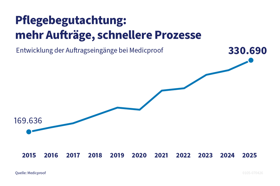 Medicproof bearbeitete im vergangenen Jahr 330.690 Pflegegutachten – ein Plus von sieben Prozent gegenüber dem Vorjahr. Trotz dieses Anstiegs sanken die Bearbeitungszeiten deutlich: Im Schnitt lag ein fertiges Gutachten nach nur 9,4 Arbeitstagen vor (Vorjahr: 10,9 Tage).
