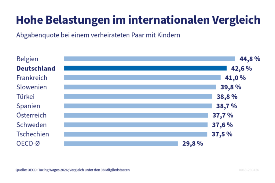 Den Berechnungen zufolge lag die Belastung eines verheirateten Paares mit Kindern hierzulande im Jahr 2025 bei 42,6 Prozent. Frankreich als drittplatziertes Land liegt 1,6 Prozentpunkte dahinter. Nur zum Vergleich: Der OECD-Durchschnitt liegt bei 29,8 Prozent.