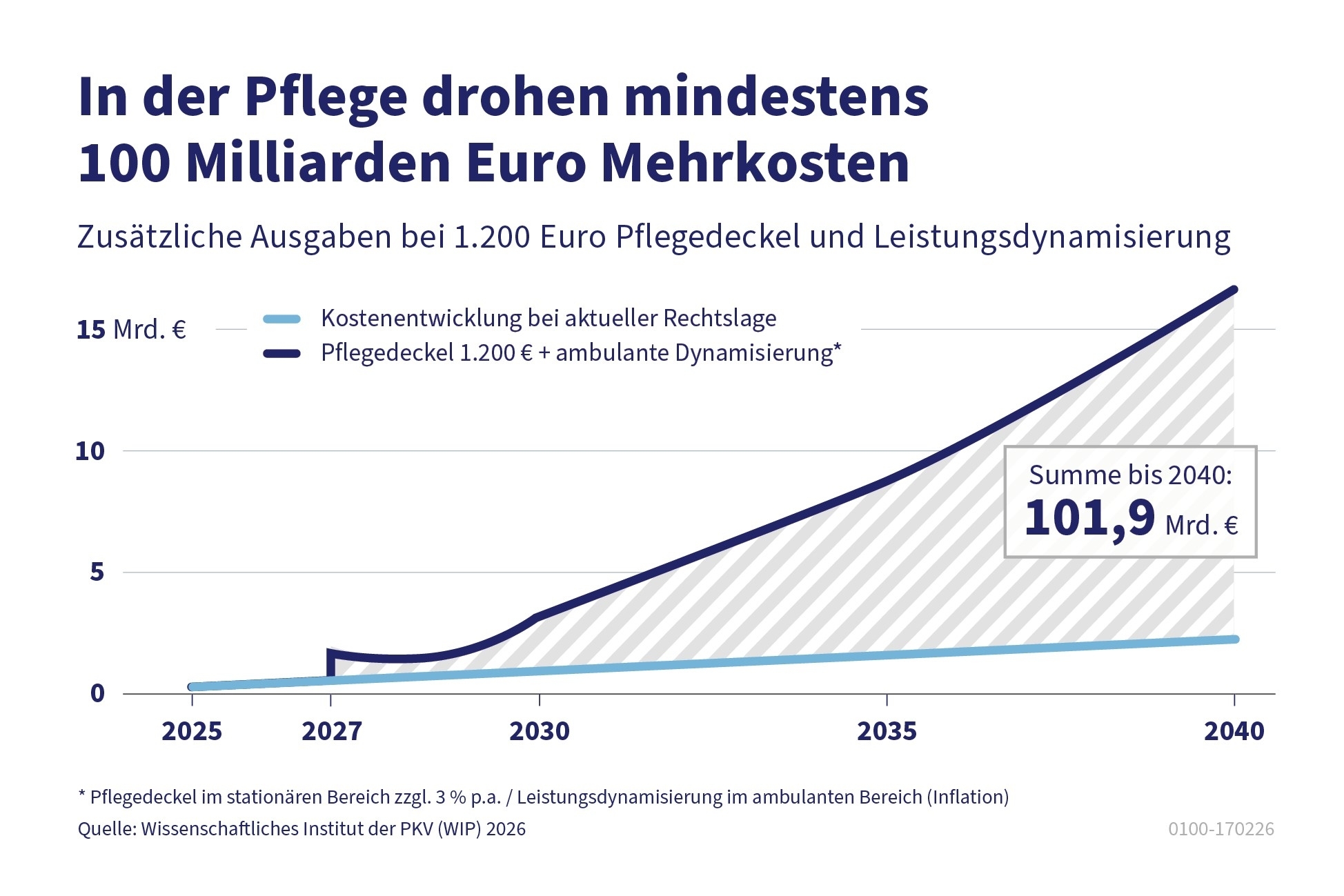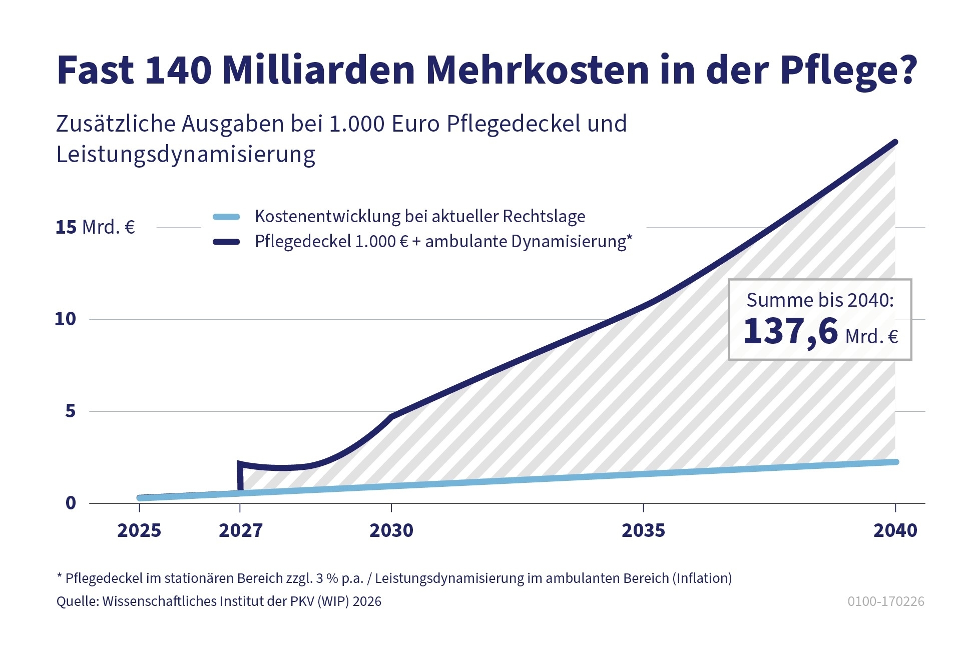 Selbst wenn sich die Politik in einer Pflegereform für die „billigste“ umlagefinanzierte Reformvariante mit einem stationären Pflegedeckel von monatlich anfänglich 1.200 Euro plus ambulanter Inflations-Dynamisierung entscheiden würde, entstände bis 2040 eine zusätzliche Generationenlast von 101,9 Milliarden Euro. Davon entfielen 8,9 Milliarden Euro auf die Jahre 2027 bis 2031 und 93 Milliarden Euro auf die Jahre 2032 bis 2040.