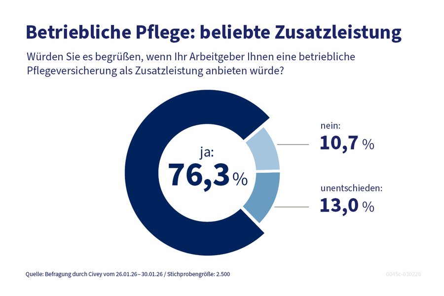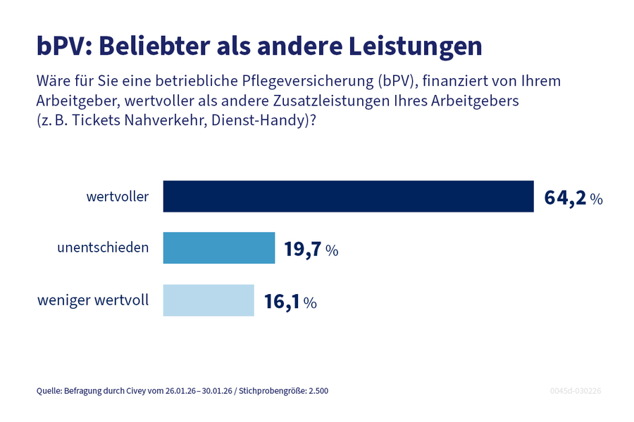 Mehr als drei Viertel (76,3 Prozent) der Beschäftigten in Deutschland würden es begrüßen, wenn ihr Arbeitgeber eine betriebliche Pflegeversicherung (bPV) zur Absicherung von Eigenanteilen im Pflegefall anbieten würde. Das ist das Ergebnis einer Online-Umfrage des Meinungsforschungsinstituts Civey im Auftrag des PKV-Verbands. Für 64,2 Prozent wäre eine solche Absicherung sogar wertvoller als andere Zusatzleistungen wie ein Dienst-Handy oder Tickets für den öffentlichen Nahverkehr.