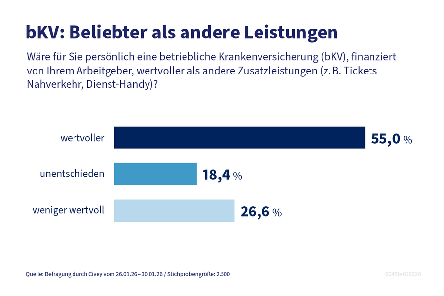 Die betriebliche Krankenversicherung bleibt zudem ein starkes Instrument im Wettbewerb um Fachkräfte. Umfragen zeigen, dass rund 68 Prozent der Beschäftigten diese Zusatzleistung vom Arbeitgeber begrüßen würden. 55 Prozent der Beschäftigten würden eine bKV sogar wichtiger finden als andere Zusatzleistungen wie Jobtickets oder Mobiltelefone.