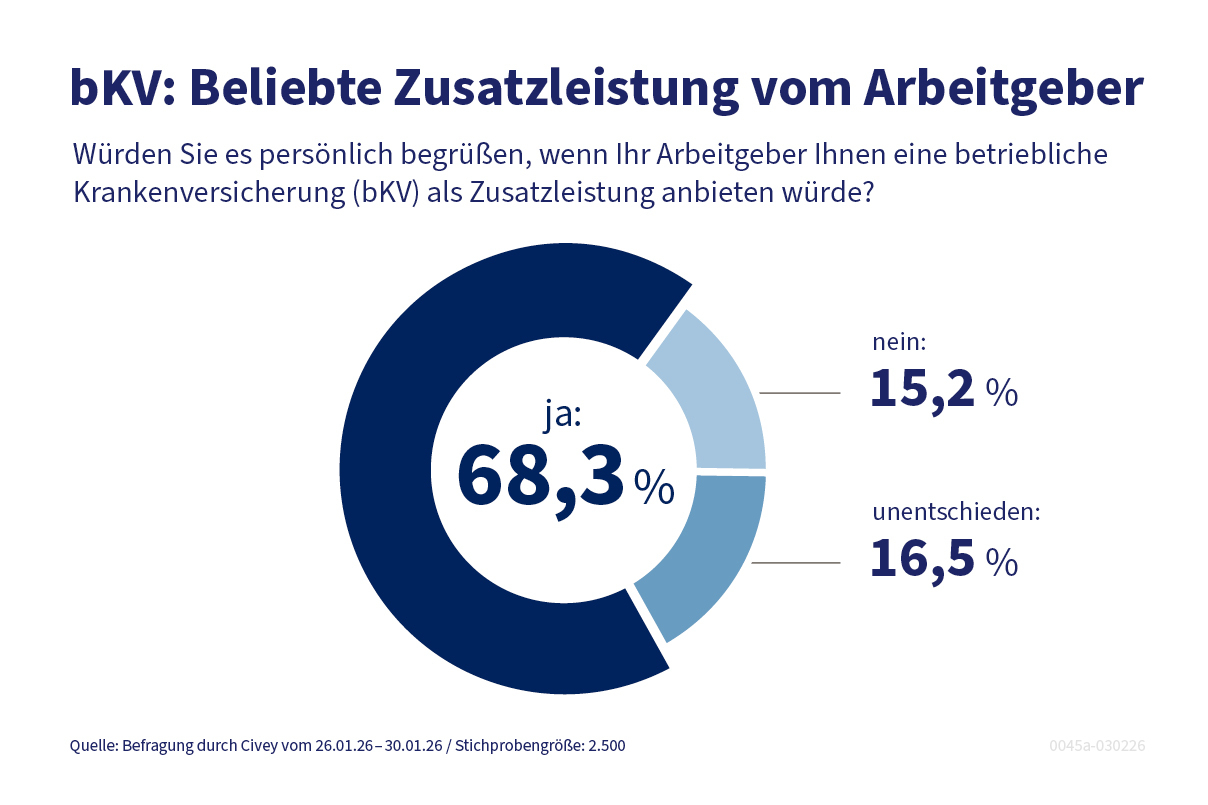 Die betriebliche Krankenversicherung bleibt zudem ein starkes Instrument im Wettbewerb um Fachkräfte. Umfragen zeigen, dass rund 68 Prozent der Beschäftigten diese Zusatzleistung vom Arbeitgeber begrüßen würden. 55 Prozent der Beschäftigten würden eine bKV sogar wichtiger finden als andere Zusatzleistungen wie Jobtickets oder Mobiltelefone.