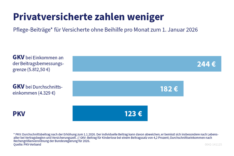 Die zusätzlichen Ausgaben infolge der jüngsten Pflegereformen wirken sich auf die Beiträge aller Pflegeversicherten aus, also auch in der Sozialen Pflegeversicherung (SPV). Zum Vergleich: In der SPV wurden die Beiträge bereits zum 1. Januar 2025 erhöht. Der SPV-Beitragssatz stieg von 3,4 auf 3,6 Prozent (für Kinderlose von 4,0 auf 4,2 Prozent).